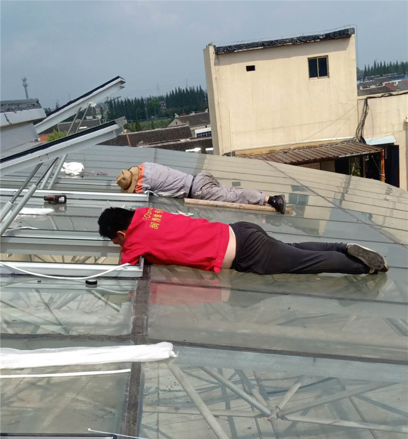 屋面滑、高是現場安裝的主要困難,鑫友售后人員憑借豐富的經驗,嫻熟的技能,保證了安裝進度。