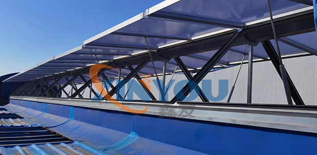 鑫友承接中車唐山8列動車組涂裝廠房電動采光排煙天窗的設備供應及安裝工程,天窗選擇鋁合金電動三角形采光排煙天窗,配置螺桿式開窗機,消防聯動控制箱。