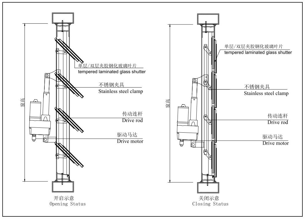 Brand new glass louvre with sunshade, decorate, natural visual function. It has best transparency(made up of transparent or ground glass), can bring visual effect. Glass louvre can instead of glass curtain wall, open and close freely and keep crystal clear.