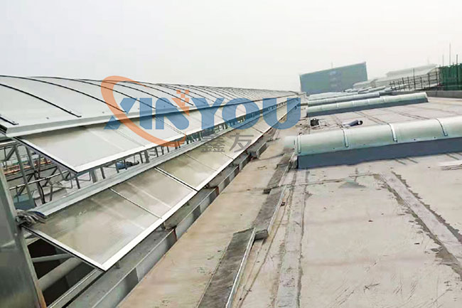 鑫友工業類電動消防排煙天窗主要適用于廠房等工業類大型建筑的屋頂采光、通風、排煙,設計依據建筑標準設計圖集09J621-2。